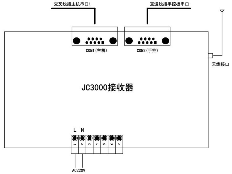 ● 將接收器安裝于信號機(jī)箱內(nèi)合適位置,并將對應(yīng)端子連接到信號機(jī)指定接口上(COM1接主機(jī),COM2接手控板),接好AC220V電源;